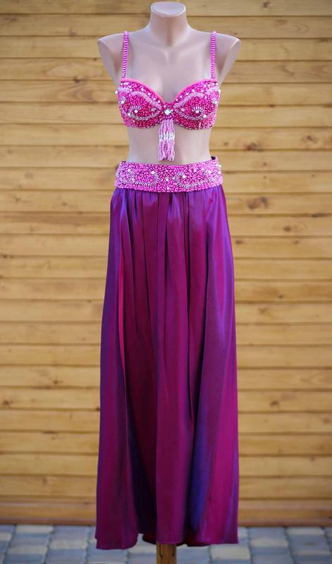 Красивый фиолетовый восточный костюм. Состояние идеальное. В комплекте идет две юбки. Подойдет на размер S – маленькая М, но лучше ориентируйтесь на замеры. Замеры лифа: Ширина в груди – 35 см. тянется до 40 см Ширина под грудью – 33 см. (на последний крючек) тянется до 40 см Высота лифа – 13 см. Замеры пояса: Длина – 82 см Ширина – 7 см Замеры юбки: ПОТ - 39 см (можно перешить пуговицу сделать меньше или больше) ПОБ – свободно Длина – 96 см